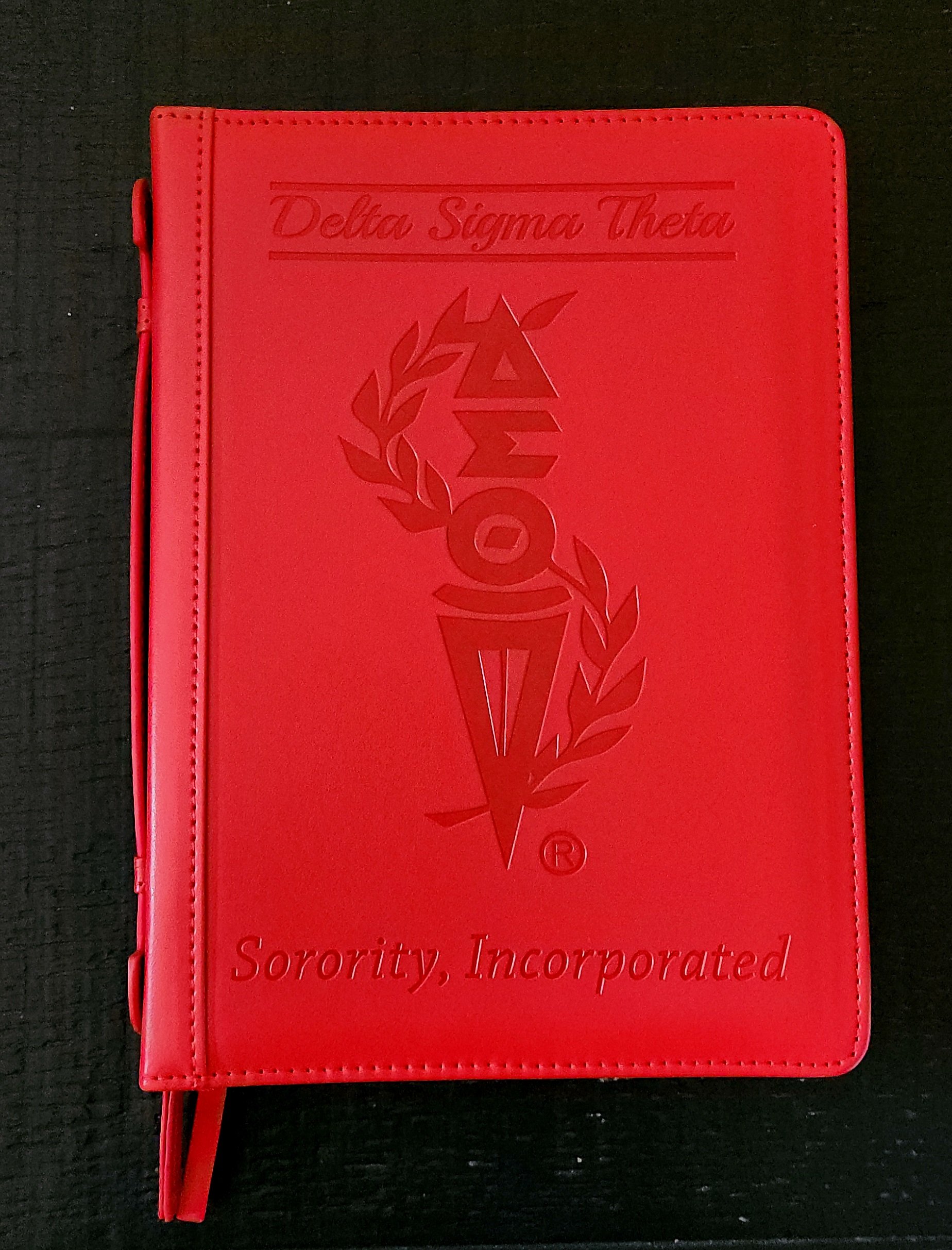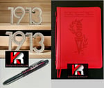 -Red, embossed ritual cover. Cover zips, has inner pockets, and a handle that says "Since 1913