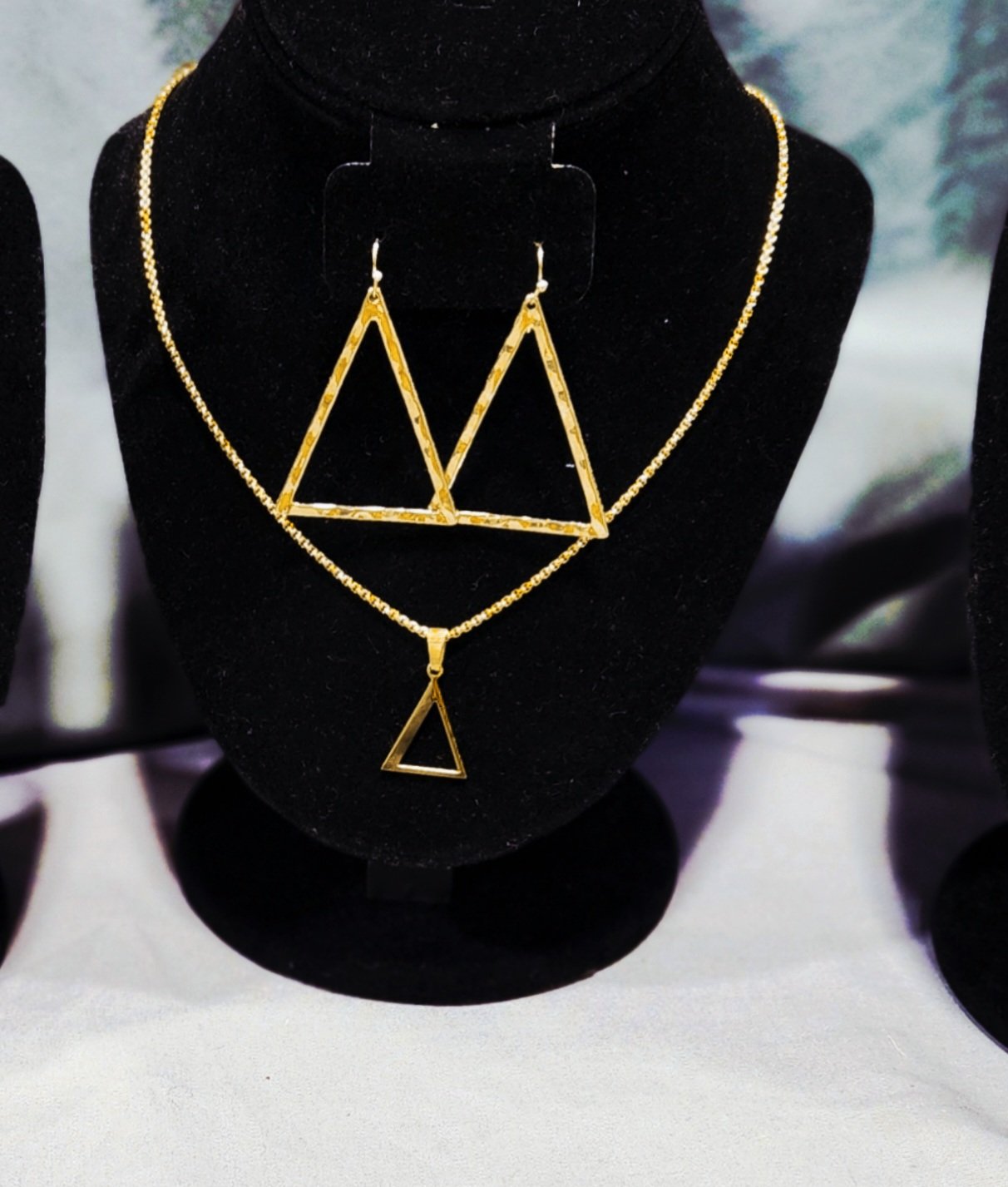 Stainless steel gold necklace with matching pyramid dangle earrings. Easily dresses up or down ANY outfit!