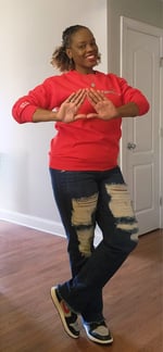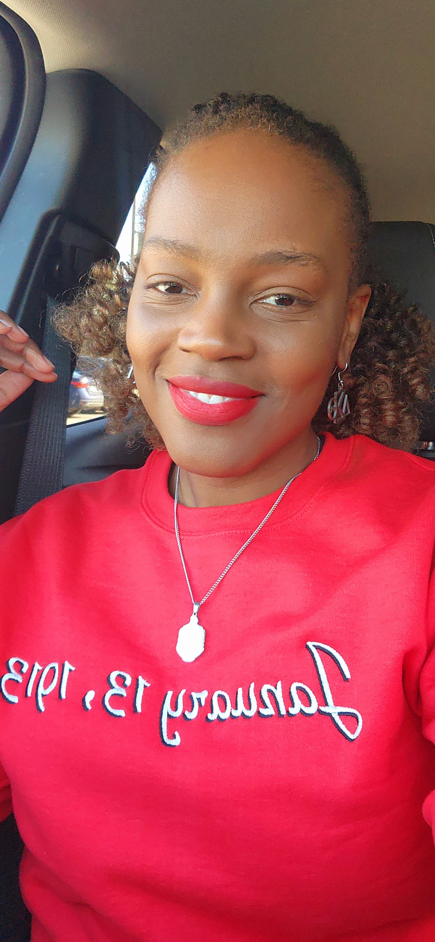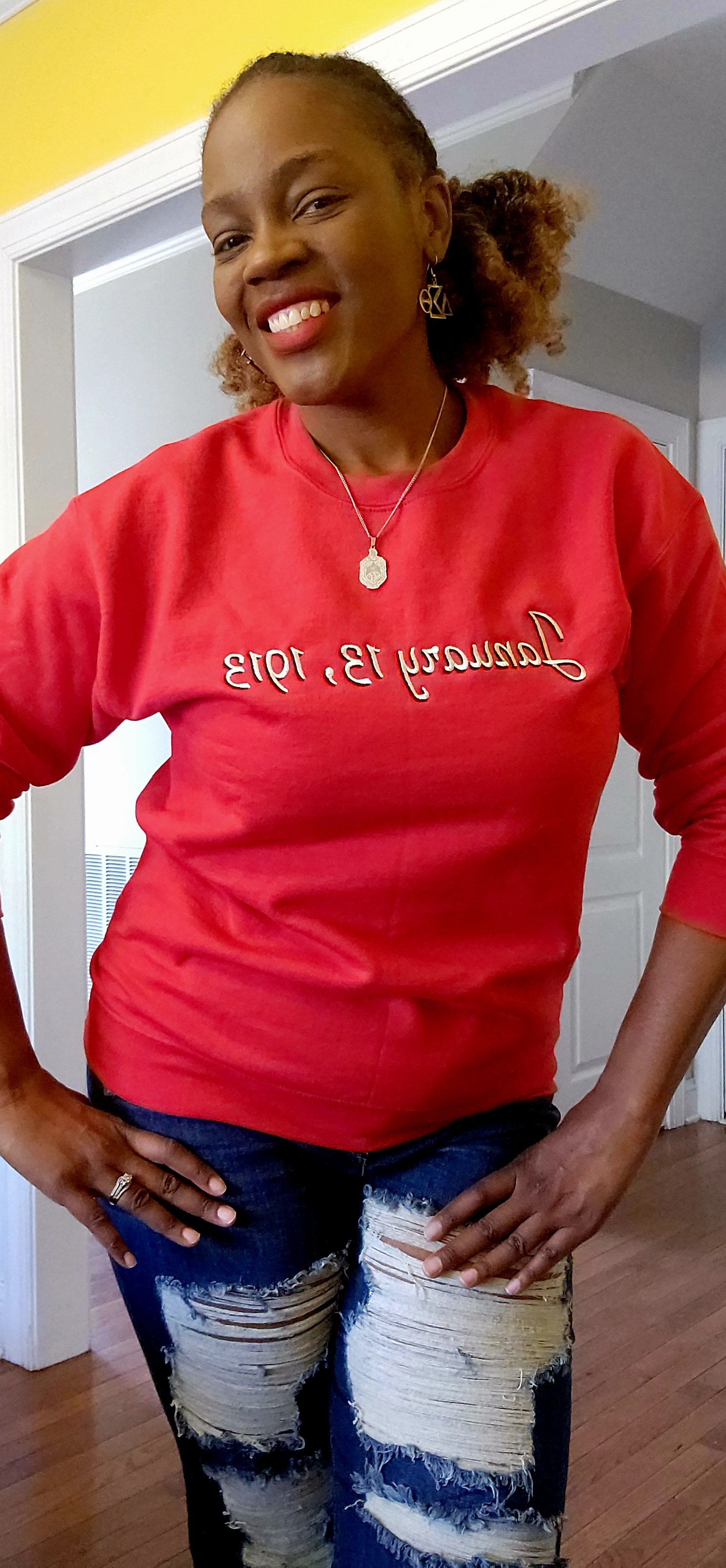 Red Crew neck sweatshirt that can be dressed up or down. I like to even fold it under to get that trendy cropped look. Great to discrete celebrate at work or out and about, but also an easy way to rep your FAVORITE D9 Founders Day all winter, fall and early spring.